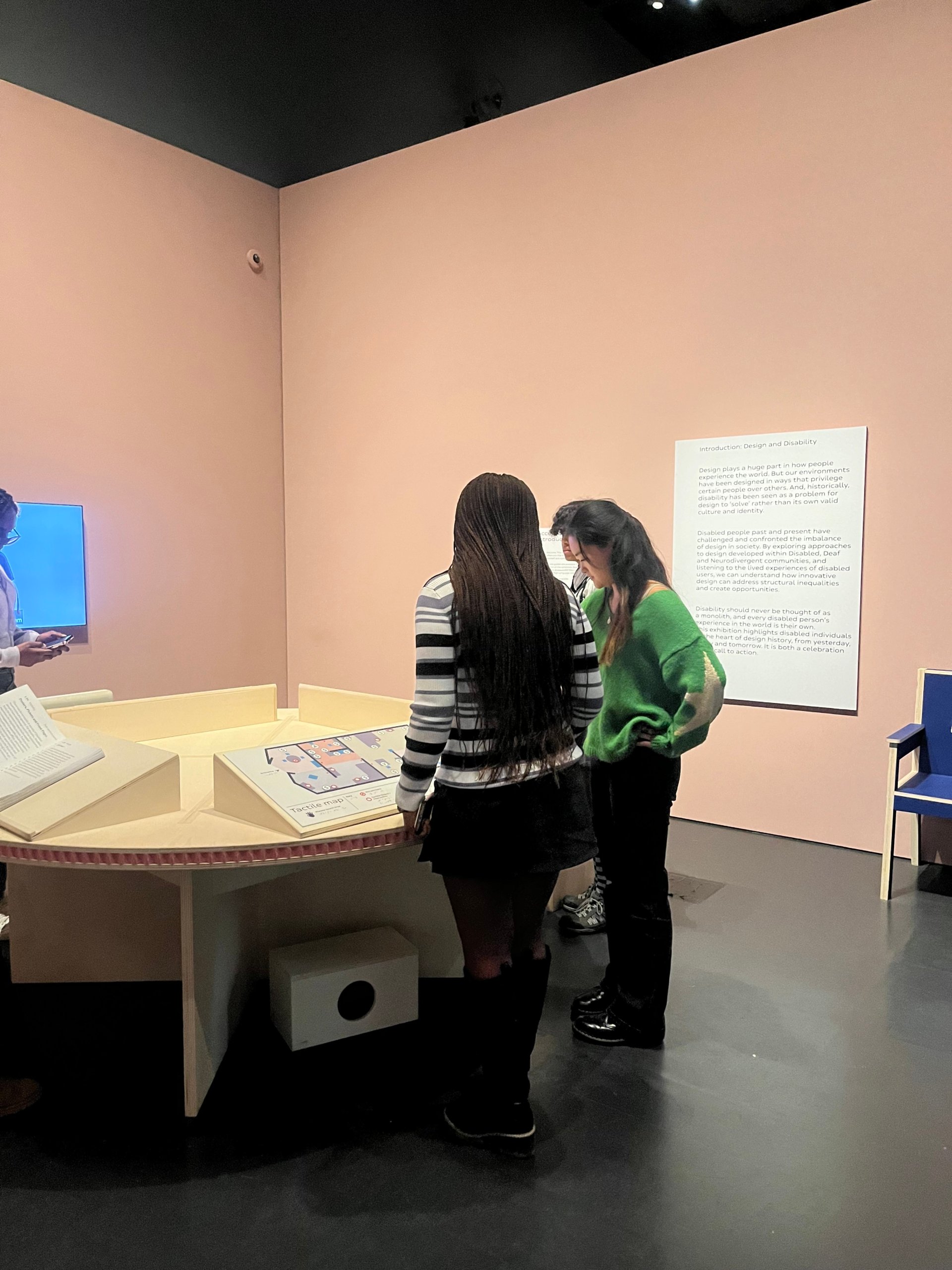 The group then took a deeper dive into the practicalities of the inclusive design, talking about things like DeafSpace design and how to improve accessibility for people with visual impairments. Students were encouraged to be open and notice things they wouldn’t have before and reflect on how these features make the exhibition more accessible. They were then given a creative brief and tasked with thinking of ways to make the V&A and future exhibitions more inclusive.